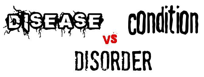 First ,what’s the difference between the terms condition, disease, or disorder? According to the Merriam Webster Medical Dictionary: